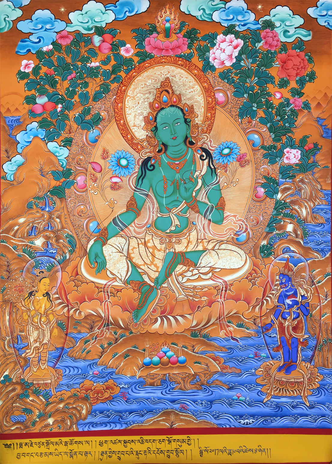 綠度母即觀世音菩薩之化身,為二十一度母之主尊,持通本尊咒,能總持二十一度母之功德。修持此尊密法,能斷生死輪回,消除一切魔障、業障,并能消災增福,延壽廣開智能,凡有所求無不如愿成就,且命終往生極東世界。唐朝的文成公主咸信是綠良母的化身。