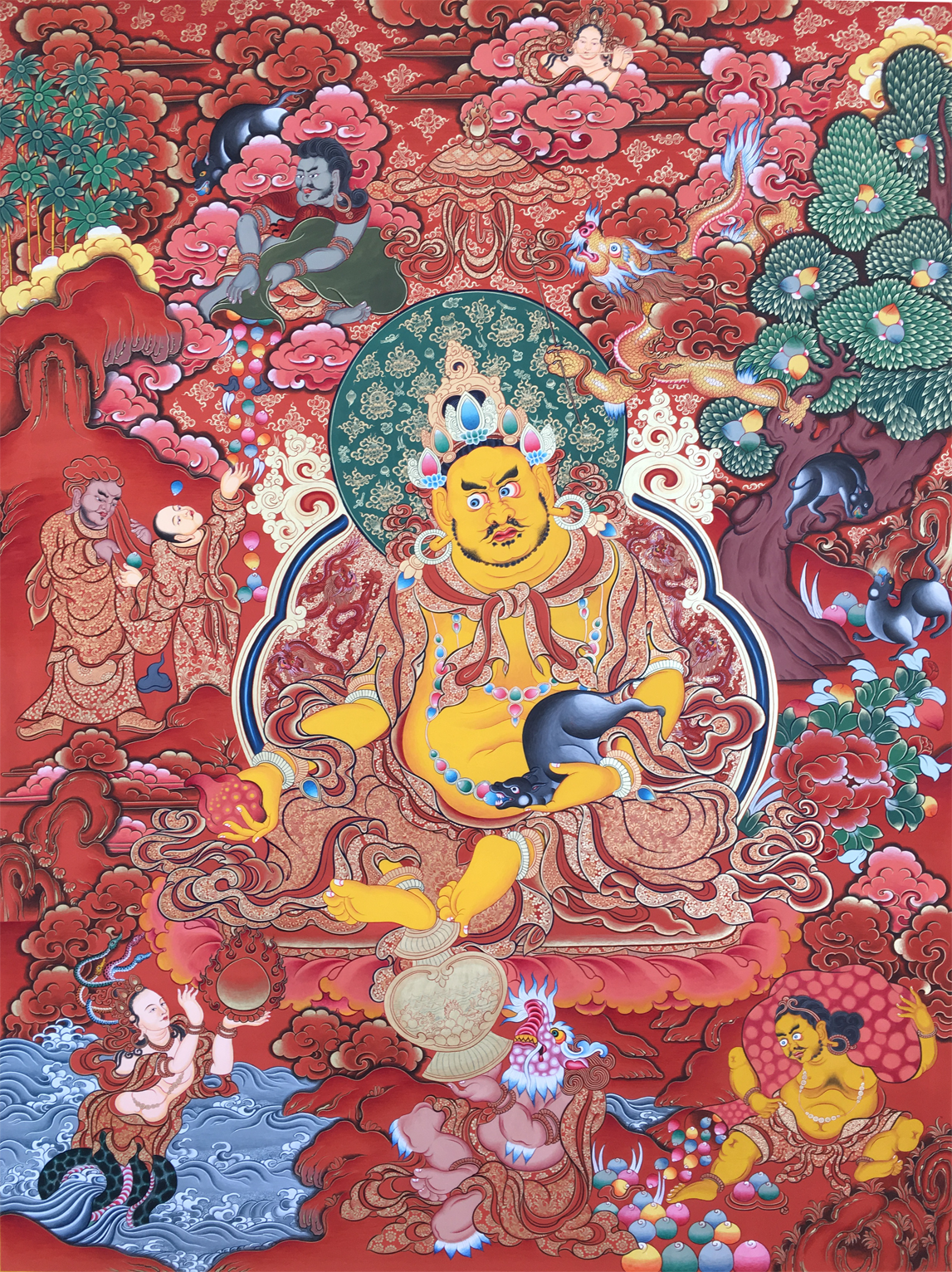 黃財神即黃布綠金剛,藏名為:“藏巴拉 些玻”。財源廣黃財神為五姓財神之一,主司財富,能使一切眾生脫于貧困,財源廣進。當初釋迦牟尼佛于靈鷲山宣傳說大般若經時,諸魔鬼神等皆前來障礙,令高山崩塌,大眾驚恐,此時黃財神就現身庇護,后來世尊囑咐黃財神,當于未來世助益一切貧困眾生,為大護法。