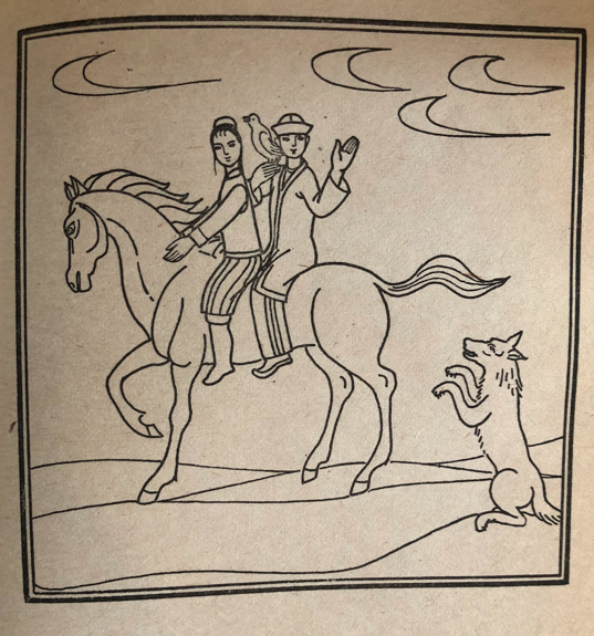 汗想坐得靠近那個美女一點兒,可是,他剛往前一湊,美女一下子變成了狼,上去把汗抓了個頭破血流,然后很快地跑掉了。狼又從后面趕上了少年和那位姑娘。少年又對狼說:“我也不想跟這匹馬分開了,能不能想個辦法呢?”狼說:“可以。”在回到第一個汗的附近時,狼又搖身一變,變成了一匹駿馬。少年牽著駿馬送到汗那里。汗回謝以后,就給了他那只金絲鳥。少年帶著金絲鳥和姑娘一起騎上馬又走了。