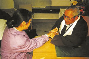 藏醫正在為患者進行脈診