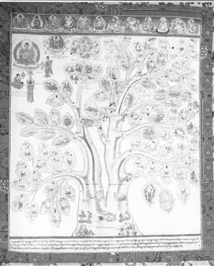 藏族“湯卡”的繪制有一個特點,就是不注明繪制日期或繪制人的姓名(除個別的“曼湯”外),但藏族“曼湯”卻另有特點,就是在“曼湯”的最上方留有一定位置來繪制醫(yī)學(xué)中的重要人物,特別是古代醫(yī)學(xué)家。藏族古代醫(yī)學(xué)家往往也是宗教人物。