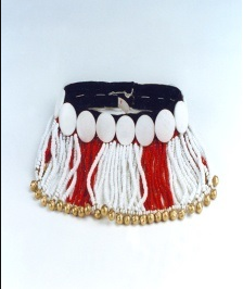 民族文化宮博物館收藏的這件傈僳族綴彩珠女子“歐勒”帽,于上世紀70年代征集于云南省怒江地區。整個頭飾直徑16厘米、重534克,質地為琉璃質、銅質和海貝。帽身墜有24條紅珠、38條白珠,珠體直徑約0.5厘米,紅白珠串相間分布,每組珠串下墜有金色銅鈴,共29個,環繞整個帽身排列縫綴16個直徑約3厘米左右的白色海貝片。整個“歐勒”帽色彩鮮艷,制作精美,佩戴起來襯托得傈僳族女子光鮮亮麗、風姿綽約。