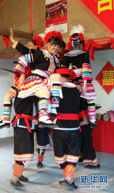 瑤寨的男女青年為游客表演瑤族婚俗