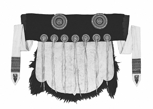 剪裁時(shí),將羊皮修剪成U型,上部橫鑲一段黑氆氌(毛織品)或黑呢子,內(nèi)襯天藍(lán)色棉布。其下用七對(duì)白色鹿皮條穗縫綴并列的七個(gè)小圓形彩線繡花布盤,肩部縫綴兩個(gè)大圓形彩線繡花布盤。羊皮上端縫釘兩條繡花白布長(zhǎng)帶,帶端還繡有花鳥(niǎo)、魚(yú)蟲(chóng)、動(dòng)物、植物、幾何等圖案,據(jù)說(shuō)是象征納西族人民如蜂似蝶地奔忙,以辛勤勞動(dòng)換取甜蜜生活。