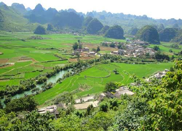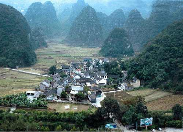 萬峰林景色豐富,登高遠(yuǎn)眺,青灰色的秀峰似林,黃綠相間的田野成片,就在這萬峰環(huán)抱當(dāng)中,靜靜橫臥著納灰小村,小河從村中靜靜彎曲流淌而過,宛如一幅濃墨重彩的山水畫卷。