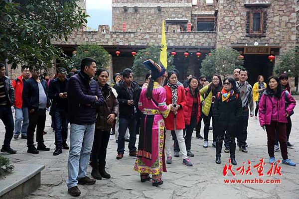 游客們饒有興致地聽導游介紹羌族文化