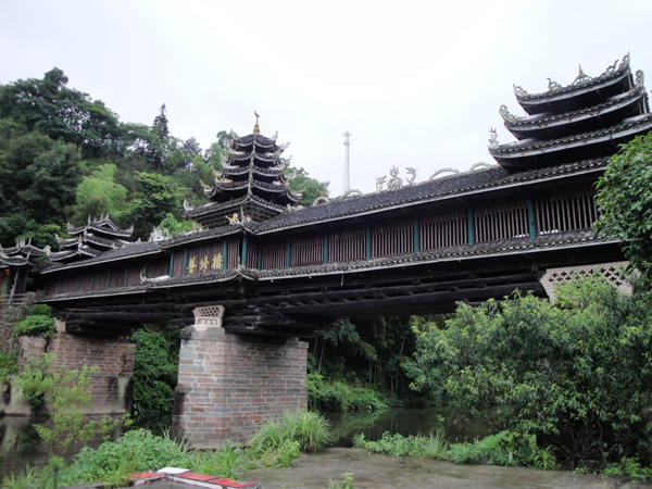 要到侗寨必須先過一座名為普修橋的風雨橋,該橋橋坐落于坪坦河上,始建于清乾隆年間,后毀于洪水,清嘉慶八年(1812)重修,1984年復修,2007年3月寨民對橋體進行維修。橋全長57.7米,寬4.2米,等分成21廊間,橋廊兩側設置通長直欞窗,四柱三間排架,橋身為重檐長廊,分設三座橋亭,橋兩端各設一橋門,橋門為重檐歇山頂。兩邊橋亭為三重檐,方形平面歇山頂式,中間橋亭有七重密檐,下三層為方形平面,上四層為八角攢尖葫蘆頂。1988年,通道侗族自治縣人民政府行文公布為縣級文物保護單位,1989年公布法定保護范圍和建設控制地帶。現在主要功能為新寨與外界聯系的紐帶和村民休閑娛樂場所。