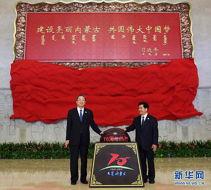 70年來(lái),在黨中央高度重視、關(guān)心關(guān)懷下,內(nèi)蒙古各族人民在革命、建設(shè)和改革的各個(gè)歷史時(shí)期,創(chuàng)造了一個(gè)又一個(gè)人間奇跡,萬(wàn)里草原發(fā)生了翻天覆地的歷史巨變。圖為8月7日,中共中央政治局常委、全國(guó)政協(xié)主席、中央代表團(tuán)團(tuán)長(zhǎng)俞正聲率中央代表團(tuán)出席向內(nèi)蒙古自治區(qū)贈(zèng)送紀(jì)念品儀式,俞正聲和內(nèi)蒙古自治區(qū)黨委書記、人大常委會(huì)主任李紀(jì)恒一同為習(xí)近平總書記題詞賀匾揭幕(新華網(wǎng))