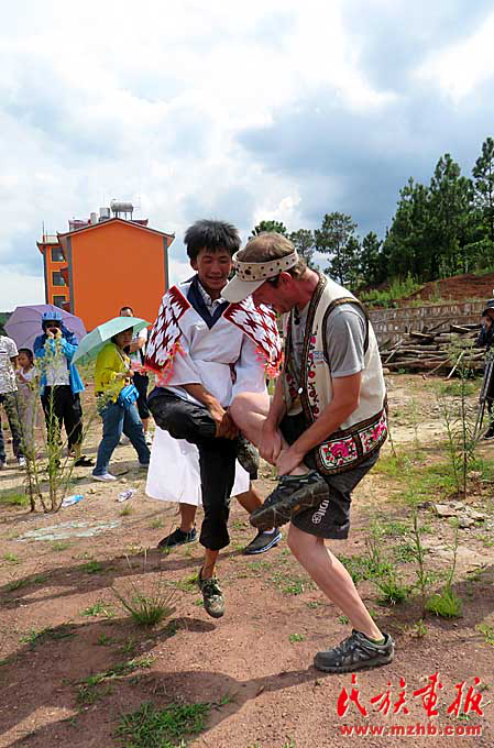 在游樂園里,外國朋友饒有興致地參加傳統民族體育項目