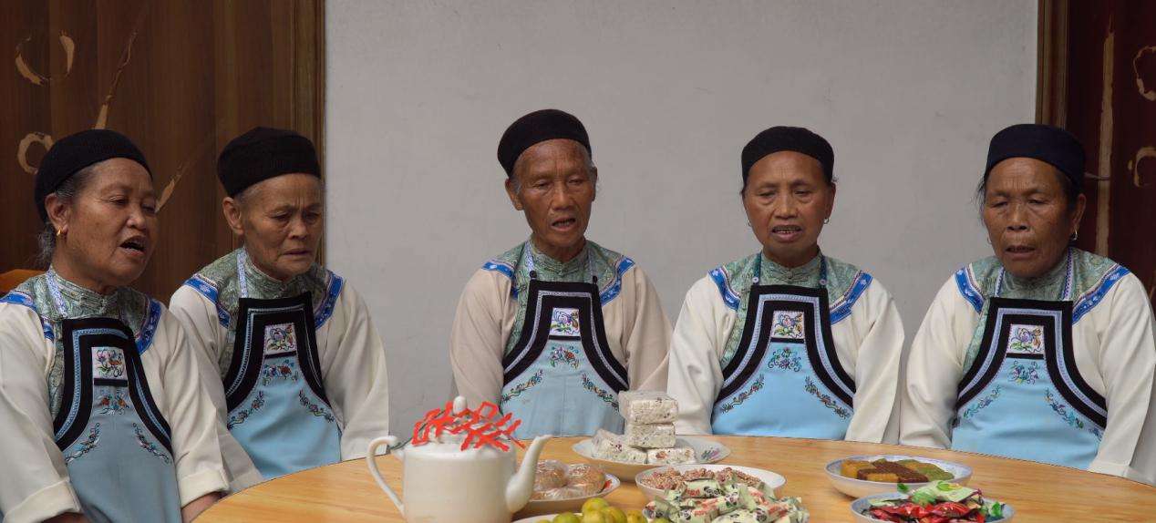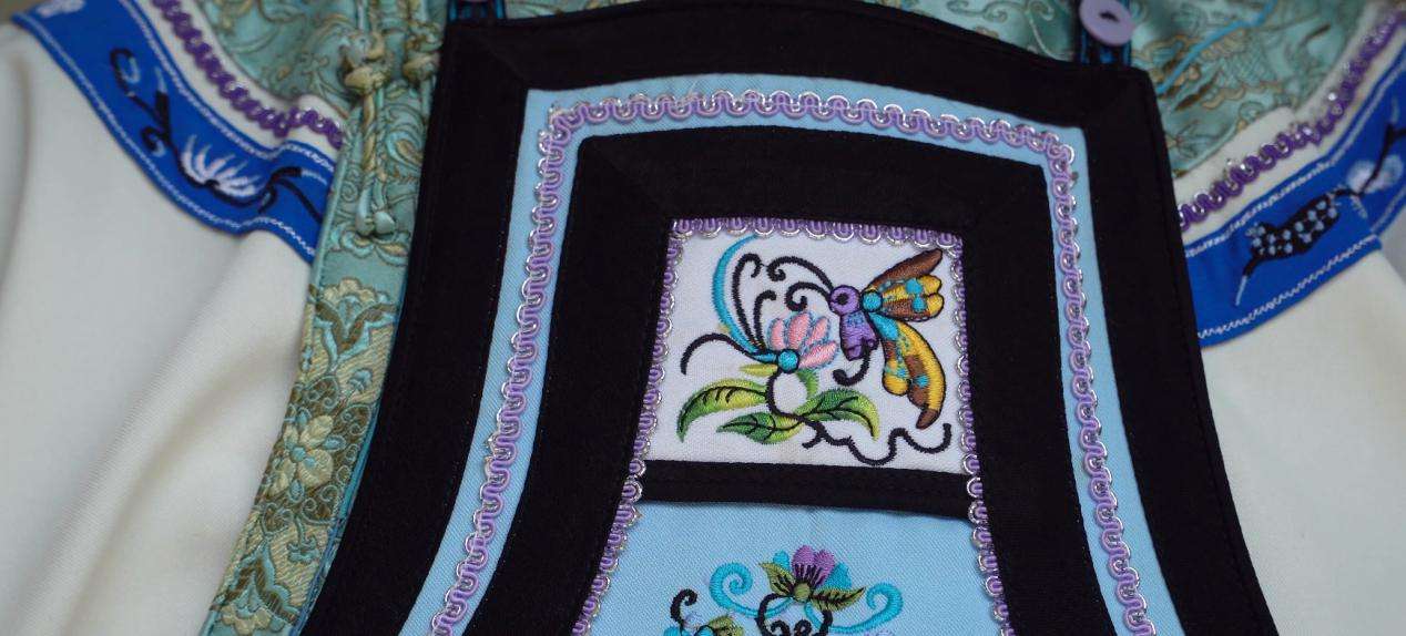 紅星村村內布依族村民保留有布依族傳統服飾,在日常生活中也還有穿著布依族服飾的習慣。紅星村布依族女性服飾做工精細,款式多樣。老人頭戴黑色圓帽,上身主要穿著灰白色斜襟上衣和青藍色打底的圍腰,上衣領口至兩肩處繡有大面積花紋圖案,圍腰上部也繡有花紋圖案作為裝飾。圍腰上的兩條絲帶系于身后,絲帶上繡有花紋圖案。下身穿著灰色長褲。
