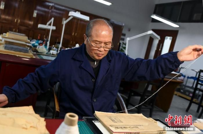 圖為師玉祥將修復完成的古籍進行穿線訂書。 楊華峰 攝