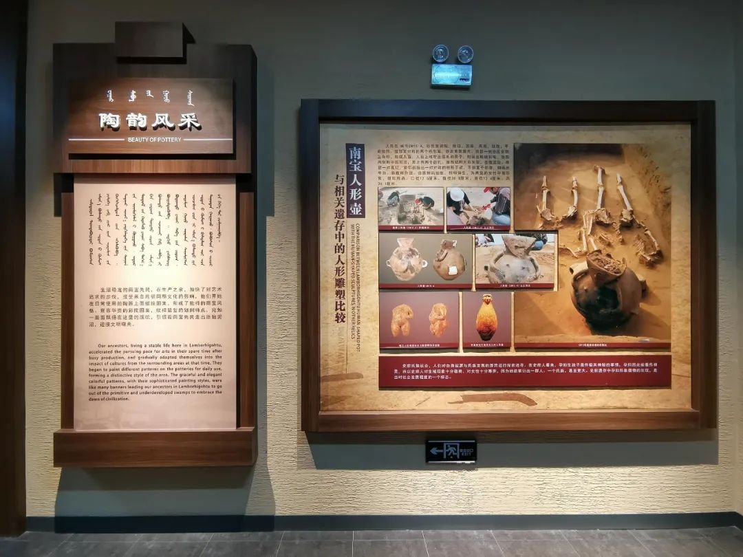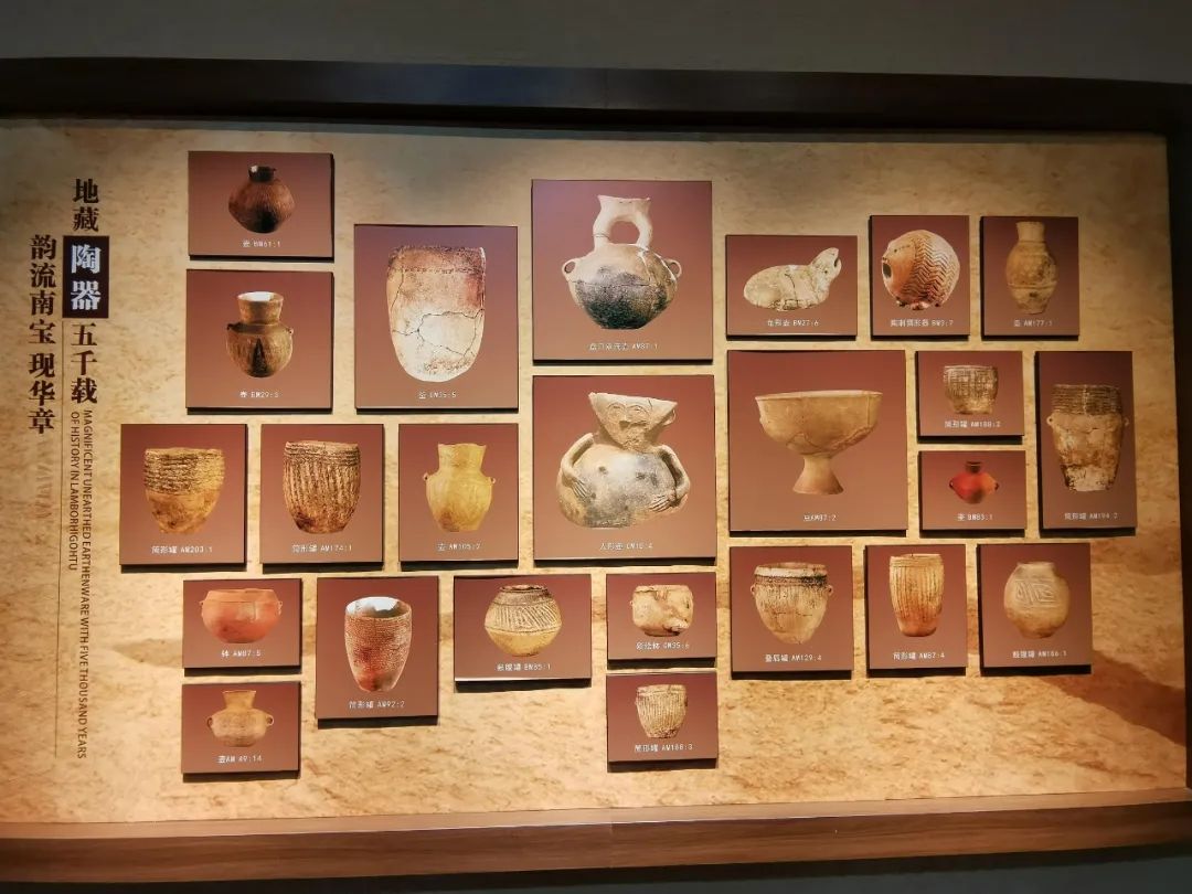 陶韻風采;生活穩定的南寶先民,在生產之余,加快了對藝術追求的步伐,接受來自周鄰同期文化的影響,他們開始在日常使用的陶器上面描繪圖案,形成了獨特的南寶風格。雍容華貴的彩陶圖案,紋樣繁復的劃刻特點,宛如一面面飄揚在這里的旗幟,引領著南寶先民走出原始泥沼,迎接文明曙光。