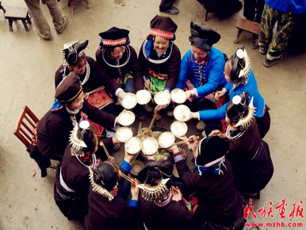 “和氣飯”后新郎家大擺酒席招待來賓,主客共飲,敬酒對(duì)歌。歡笑聲中,幸福的喜悅洋溢在新郎和新娘的臉上。