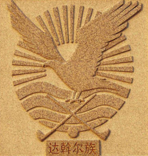 獵鷹是達(dá)斡爾族人民的吉祥物,這與達(dá)斡爾族先民曾以狩獵作為主要生產(chǎn)活動(dòng)方式有關(guān)。在以弓箭為主要工具的狩獵年代,獵鷹是達(dá)斡爾族人狩獵的得力助手。獵人騎著駿馬,用手臂托舉著獵鷹,尋游于荒野山林之中。如果發(fā)現(xiàn)野雞、野兔等飛禽和小型動(dòng)物,便令獵鷹迅速出擊。獵鷹從高空俯沖而下,能非常準(zhǔn)確有效地捕獲獵物。達(dá)斡爾人自古以來(lái)善于馴養(yǎng)獵鷹,擁有一只聰明伶俐、敏捷強(qiáng)悍的獵鷹成為獵人的驕傲。達(dá)斡爾人崇拜獵鷹,視獵鷹為忠貞、崇高、堅(jiān)強(qiáng)的象征,因此教育后代要象雄鷹一樣目光明敏銳,勇敢頑強(qiáng),不怕流血犧牲,戰(zhàn)勝前進(jìn)道路上的一切困難。