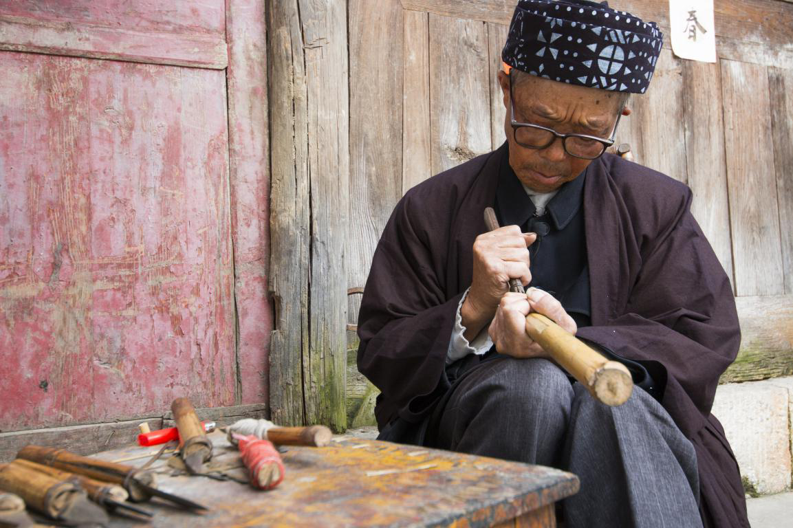批林村除了傳統民居之外,自然還有屬于他們的傳統服飾。批林村的男子傳統服飾較為簡單,主要以青藍色斜襟長衫為主,頭飾用六米長的布條圍成的帽子。在批林村鬼師的穿戴中,與眾不同的是,鬼師還會外披一件亮黃色大衣,胸前帶有銀圈。